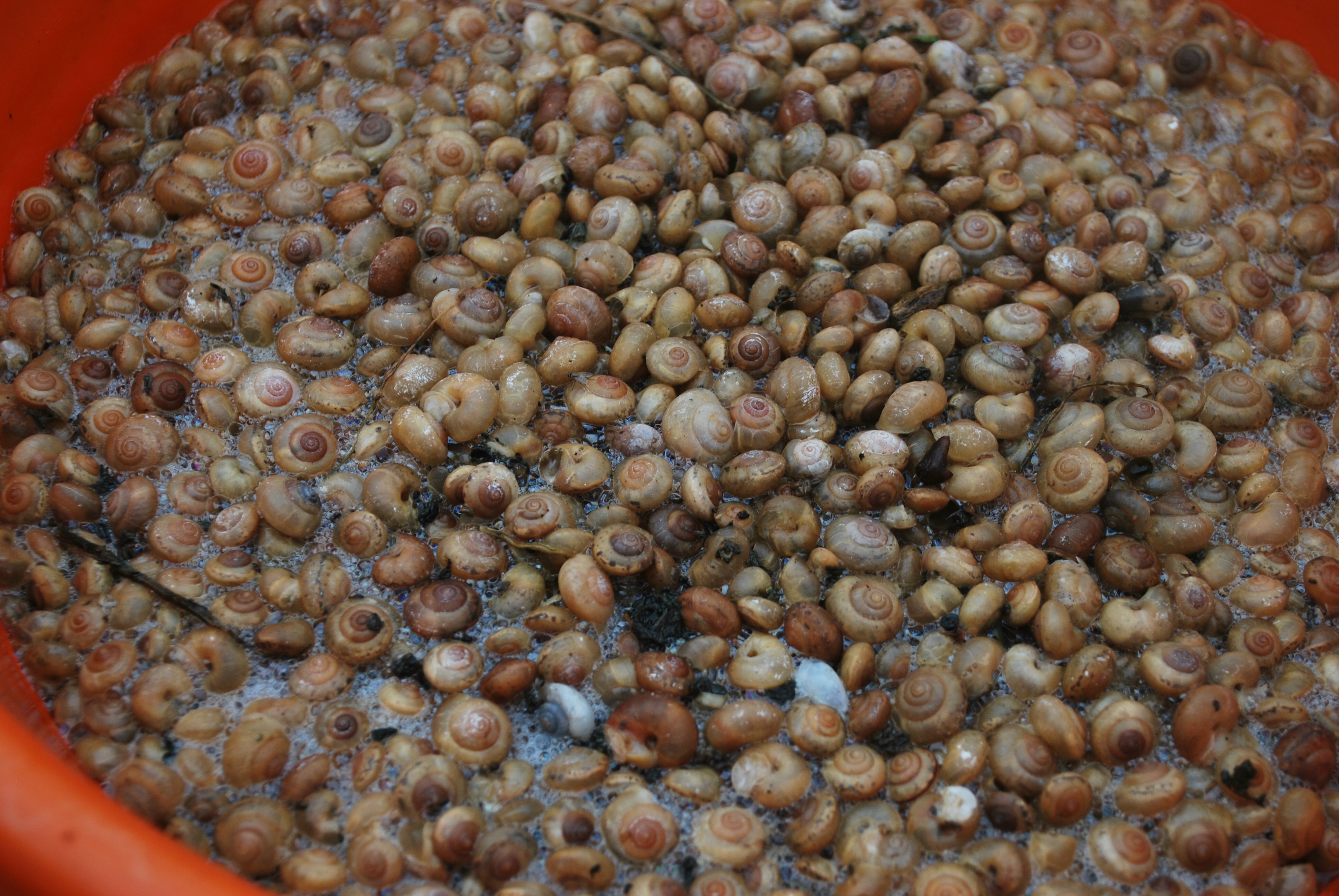 外埔區種植火龍果果農,兩天來天未破曉就泡了一大桶肥皂水,到果園抓小蝸牛,由於牠體積小抓也特別緩慢,每抓到一隻都丟入桶內,直到死亡後後再拿去掩埋,這是最環保做法,唯最可怕的是抓不到幾棵果樹就有一大桶的小蝸牛,讓人看得頭皮發麻。