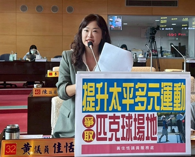黃佳恬議員表示,太平區人口持續成長,運動休閒需求同步提升,現階段太平區多數匹克球愛好者只能借用籃球場或羽球場,或跑到其它區域去打球,存在安全疑慮。要求運動局積極盤點太平區內合適的空間,規劃設置匹克球場地,完善場地尺寸、地坪材質及照明設備等等,提升太平多元運動空間,給市民安全、友善的運動環境。
