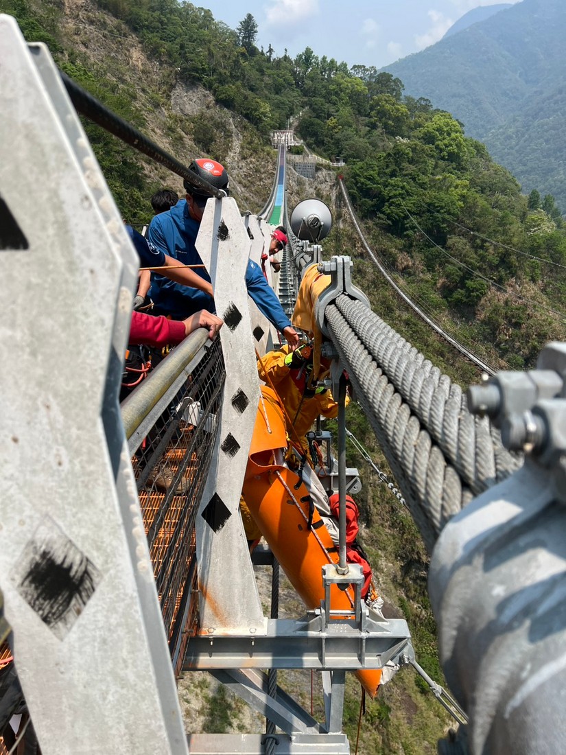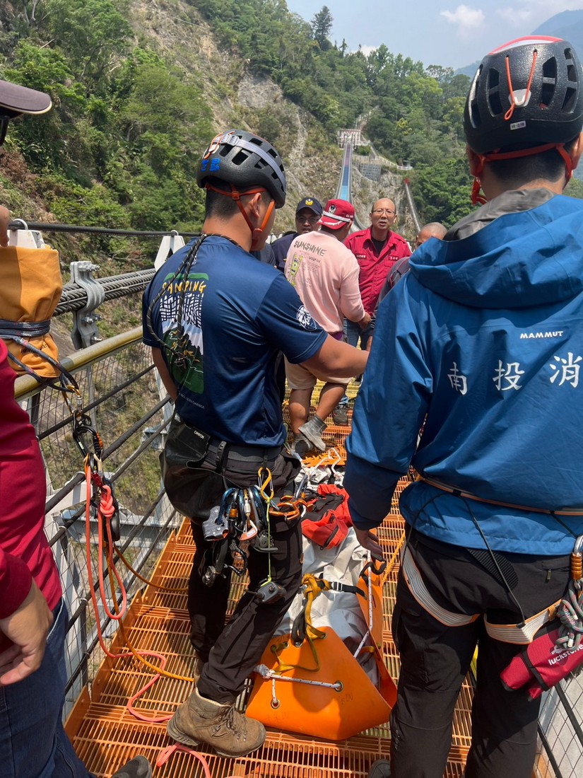 今(17)日上午 9 時,信義分隊會同警方再度挺進現場。考量從吊橋橋面至下方溪谷之深度落差高達 115 公尺(約 40 層樓高),且溪床地形崎嶇、巨石遍布,增加搜救難度,搜救小組首先出動「無人機」進行空中偵巡,透過高畫質影像回傳與精準定位,搜救人員迅速鎖定目標於溪床的位置。隨後由 6 名警消人員運用專業繩索技術,從高空垂降至深度百餘公尺的溪谷。上午 10 時許,搜救人員於溪床兩大巨石間接觸到邱員,經現場醫護資格人員評估,確認其已明顯死亡多時。因地形搬運困難,搜救小組利用捲式擔架(SKED)及繩索吊掛系統,結合地面與橋面人員通力合作,克服高度差帶來的體力考驗,於11時25分順利將邱員大體拉升至吊橋橋面,後續正式交由警方鑑識小組及檢察官進行相驗程序,以釐清確切死因。
