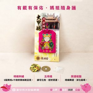 此次贈送之祈福小物,由農會員工親自前往大甲鎮瀾宮選購,並依循傳統儀式過香爐祈福,象徵將媽祖的庇佑與祝福親手傳遞給民眾。小物不僅具有收藏與紀念價值,更能融入日常生活中,成為隨身守護的祝福象徵。例如可懸掛於汽車內,祈求行車平安;繫於隨身包包,隨行守護健康與順遂;亦可擺放於家中神桌,傳遞虔誠敬意;或放置於錢包與居家空間,象徵招財納福、平安圓滿。透過多元使用情境,讓祝福不只是象徵,更成為貼近日常的心安力量。