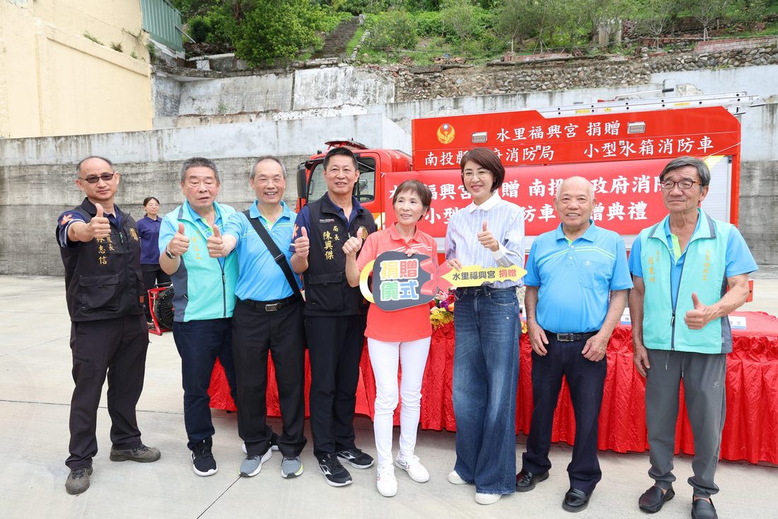 許縣長指出,她衷心代表縣政府消防局,特別是水里分隊,感謝福興宮主委白俊宏及全體管委會委員執事們對地方的關懷,相信多了這輛特別符合水里救災需求的消防水箱車,在土地公、土地婆的保佑下,能讓鄉親及地方大小事都更平安順利。除了各界持續捐贈消防、救護車輛,縣府這幾年也不斷添購因應山區救災需求的大型機具,未來,希望透過這些智慧化的救災助力,讓山區各角落災害都能夠減少,特別再次感謝福興宮對水里鄉的庇護。