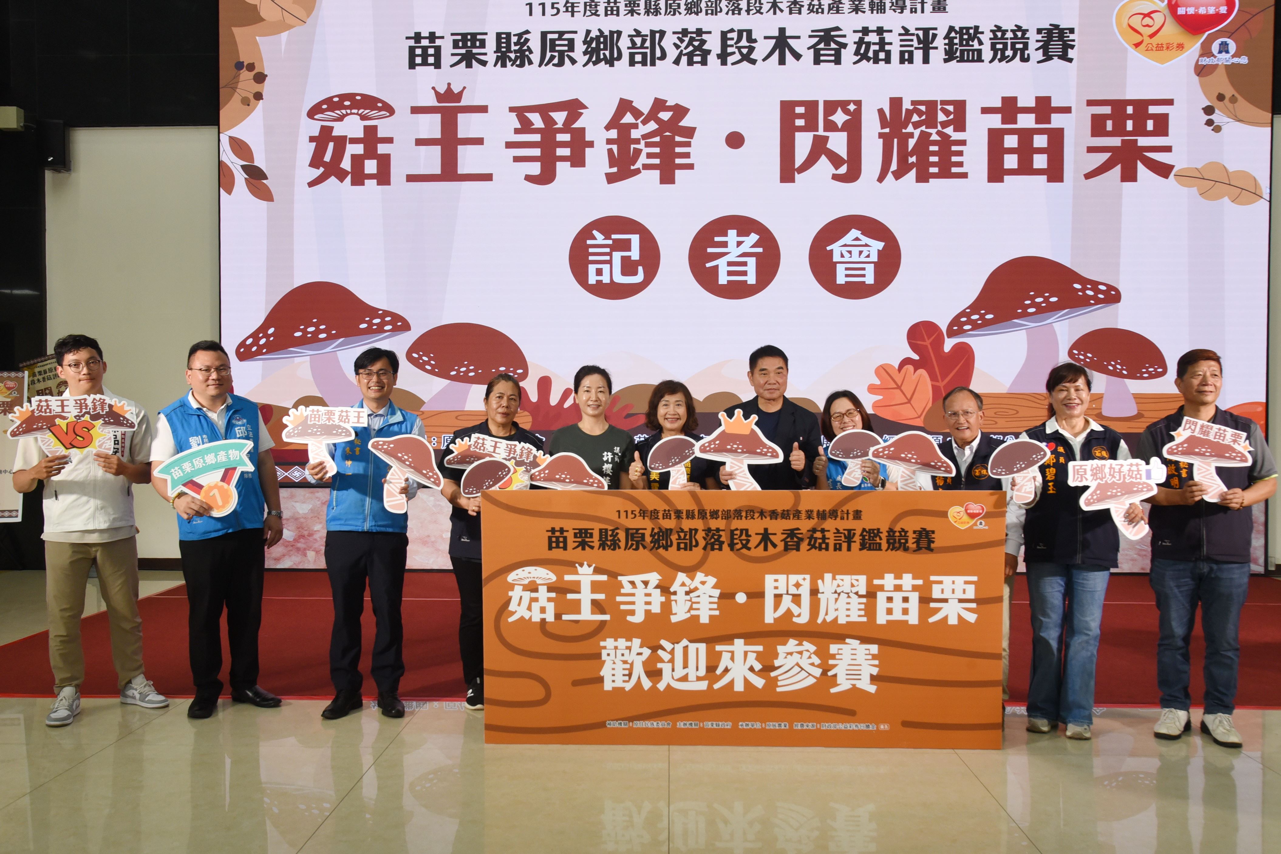 苗栗縣政府原住民族及族群發展處為讓更多民眾瞭解原鄉部落段木香菇的卓越品質與獨特風味,今年首度舉辦「菇王爭鋒.閃耀苗栗」部落段木香菇評鑑競賽,縣長鍾東錦帶領來賓舉行啟動儀式後,宣布即日起到5月4日受理報名。鍾東錦推薦段木香菇有極高的營養與經濟價值,指示農業處與原民處全力輔導即將籌備成立的段木香菇協會,推廣栽培規模並優化設備與品質,增加菇農收益,另研商將評鑑時間調整到香菇質量俱佳的秋冬時節。