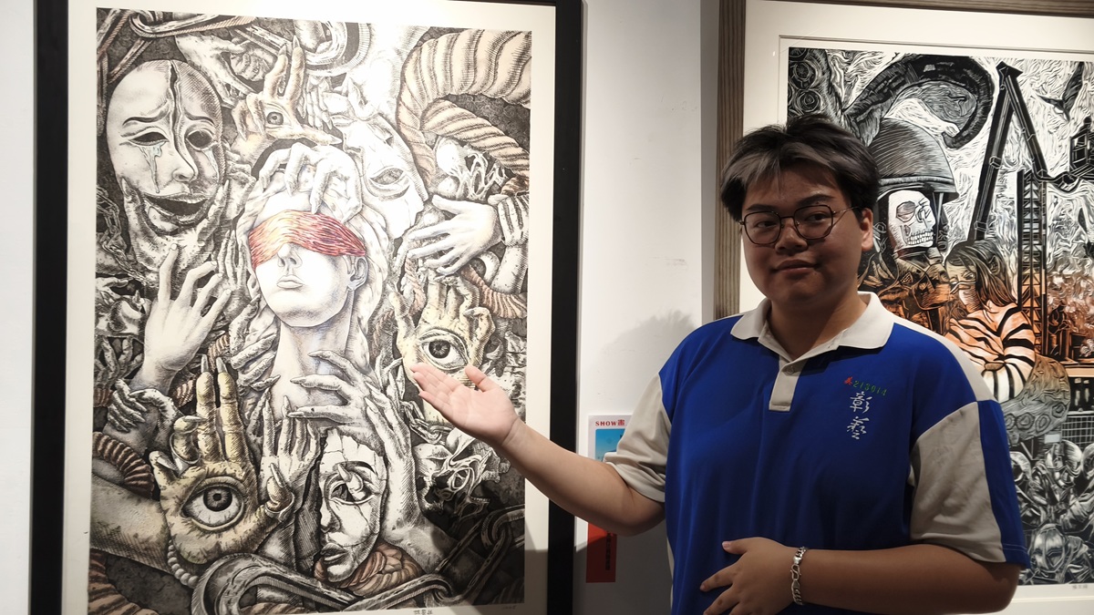 其中,主視覺採用日式飲料廣告風格,呈現夏日清涼飲品的暢快感受,也象徵當代青年青春洋溢的精神風貌;油畫作品《逝去之景》以童年夢想為主軸,透過鹿的意象,傳達人們在童年時期純粹而真實的想像與渴望;版畫作品《迷·網》則以巨大骷髏毒蠍結合手機與墜落的人物構成畫面,隱喻網路成癮對人逐漸產生的侵蝕與控制。