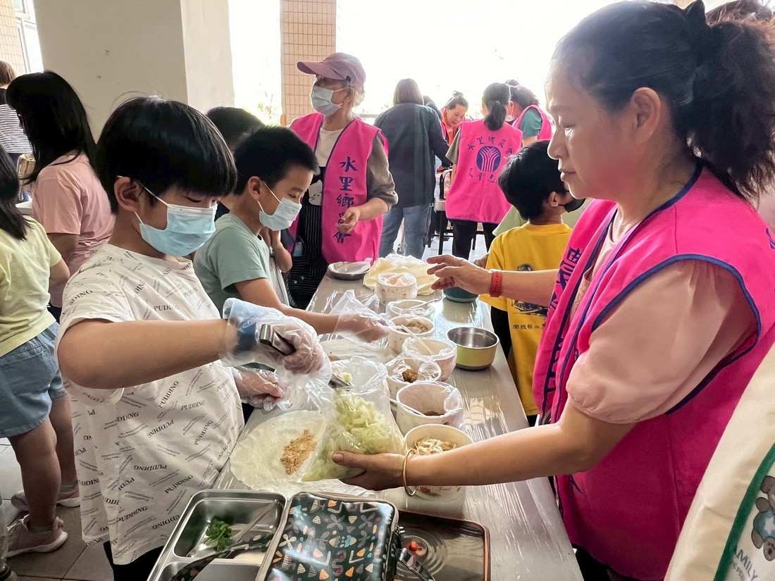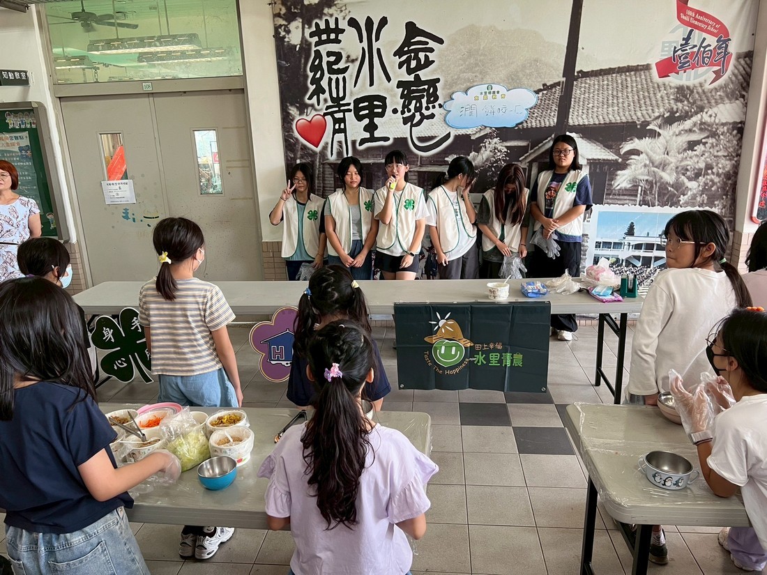 水里鄉農會舉辦「食農教育—潤餅咬一口」活動,特別帶著水里國中四健會員7名、志工10位、四健會義務指導員6位及1位青農,共同走進水里國小,指導100位師生親手製作春捲,體驗食農教育的趣味與文化。