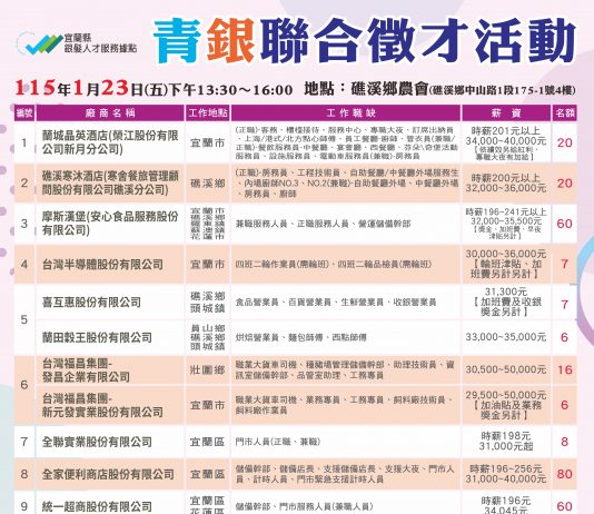 宜蘭縣政府勞工處今年1月23日(星期五)下午1時30分至4時首次於溪北...