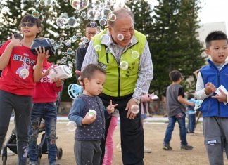 澎湖縣長陳光復今(6)日下午來到中正國小「親子泡泡好農市集」,與大小朋...